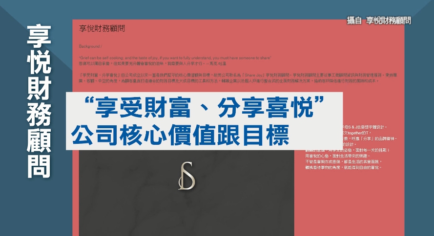 吸金被搜索約談!這個集團創立「享悅財務顧問」公司,網頁寫著,公司核心價值跟目標是「享受財富、分享喜悅」,沒想到竟是以