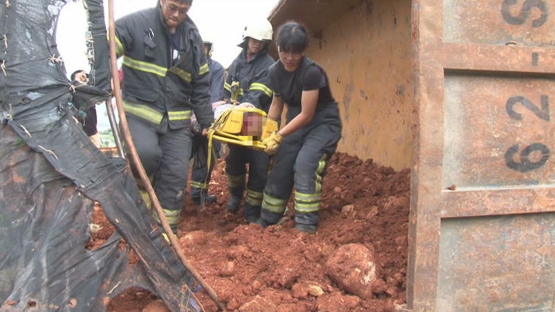 滿載土石的砂石車翻覆後,不但土石散落路面,車頭也因為重力加速度,與路旁水泥護欄碰撞擠壓、扭曲變形,消防隊員趕緊動用破壞器材,剪開車門,花了大約半個小時才順利救出受困李姓駕駛。