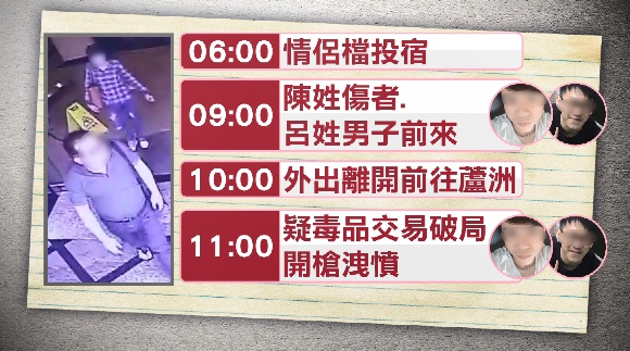 整起槍擊案就發生在28號,早上11點多台北市中山區錦西街的這處飯店,這邊鄰近捷運站,嫌犯卻大膽開槍,但想躲也躲不掉,情侶檔隨即在一小時內順利落網。面對提問,45歲的的林姓嫌犯跟34歲的陳姓女友都是低頭不語,隨即進入警局問訊,警方清查,當天清晨6點,這對情侶來投宿,到了9點,陳姓男子跟呂姓男子來找他,途中10點鐘,情侶檔又外出去蘆洲,最後11點左右,雙方疑似毒品交易破局,加上林姓嫌犯有吸毒,最後才會情緒失控開槍釀成一人受傷。