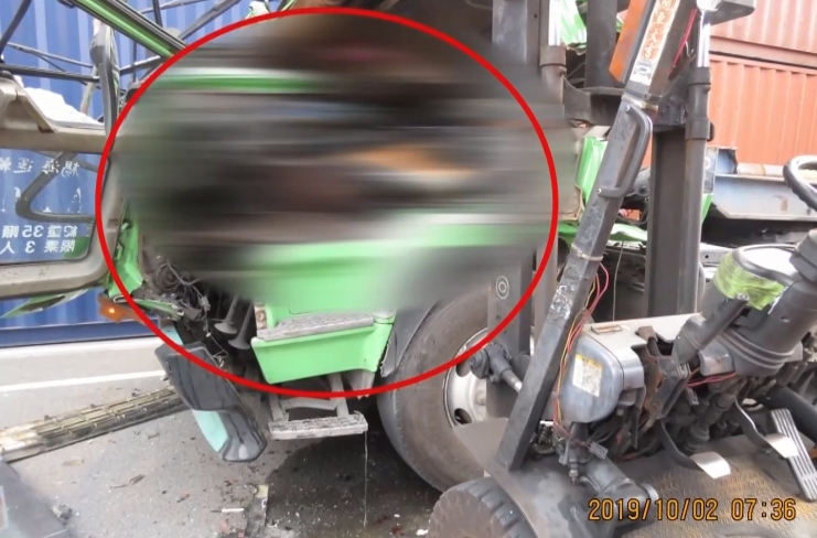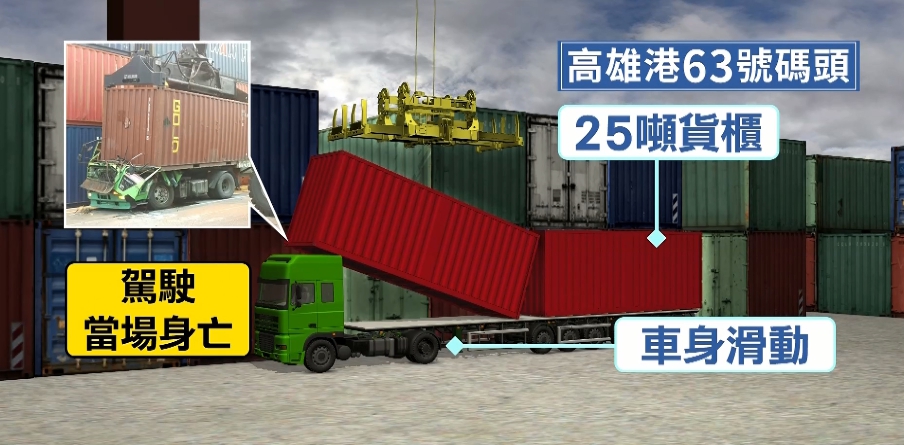 意外發生當時,張姓駕駛的貨櫃曳引車,可以載運前後各1只貨櫃,當時跨載機吊起前方貨櫃時,曳引車突然往前移動,導致吊掛中的貨櫃被後方的貨櫃撞擊,重達25噸的貨櫃就直接往前衝撞砸到駕駛座上。