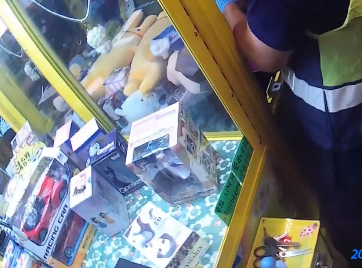 娃娃機店,沒想到,抵達時,看到一名女子坐在機台內,右手舉高無法放下,原來,她疑似在調整設備時,雙腿可能不小心觸碰遙控桿,導致手卡在電動馬達附近,還好,消防人員出動工具將設備拆下來,終於協助女子脫困。