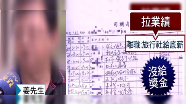 姜先生指控新北市一間旅行社,以優良福利招募員工,達到七萬業績就可以得到三成獎金,但事後卻發現,努力拉業績,獎金卻不如預期,還只有得到兩萬塊底薪,難以養家活口。離職後,他還加碼指控,旅行社要求沒有導遊執照的司機,載旅客到觀光景點,還得兼任導遊,但旅行社低調表示,獎金問題是公司內部的事,不願多談,也低調否認叫司機兼任導遊。