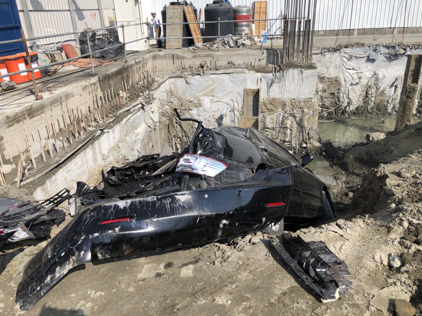 昨日下午1時許,警方獲報趕到台南市安平區永華路2段龍騰建設工地,驚見一團廢鐵轎車被推入地基坑,情景慘不忍睹,現場早已人去樓空,只見還留有一台怪手。