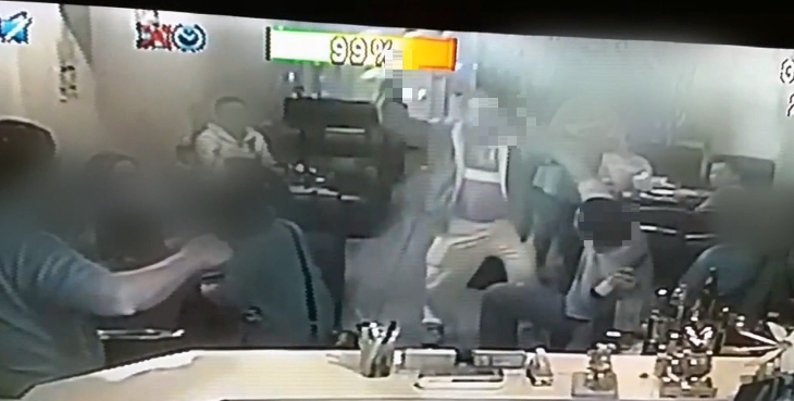 一名壯碩男子,本來坐在沙發上和朋友聊天,卻突然起身,從身上拿出預藏的西瓜刀,砍向另一桌背對他的年輕男子好幾刀,像是有仇恨似的,嘴裡不斷念念有詞,他的朋友趕緊衝上去抱住制止,本來在吃飯的客人嚇得紛紛閃避,店家也立刻幫忙報案。