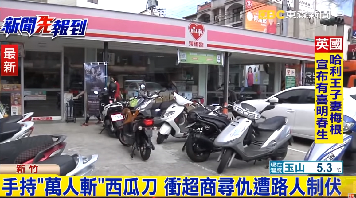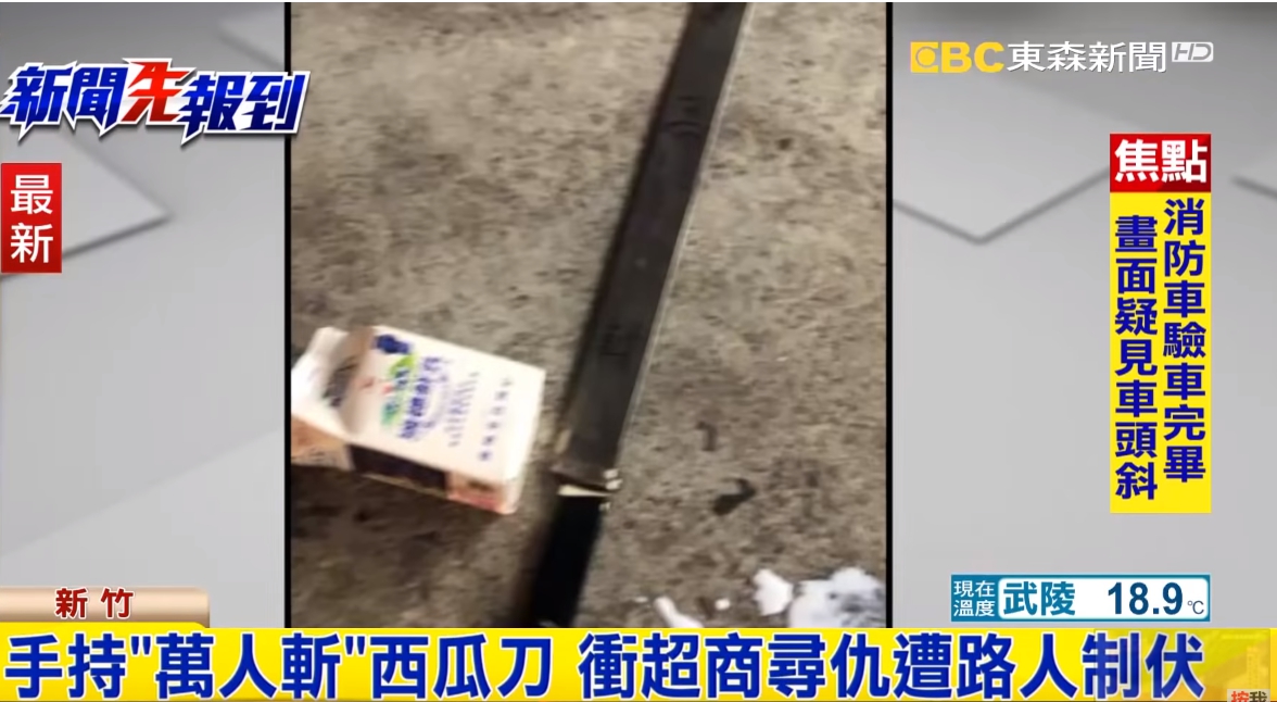 時間回到稍早前,15號凌晨,新竹這名27歲曾姓男子疑似和陌生人發生口角,以為仇人進到超商,拿西瓜刀想嚇唬對方卻撲了空。持刀男子一出超商大門,就被經過的路人制伏,上頭寫有「萬人斬」的西瓜刀也被警方帶回。