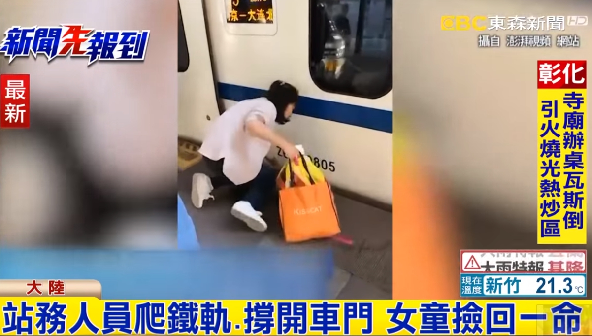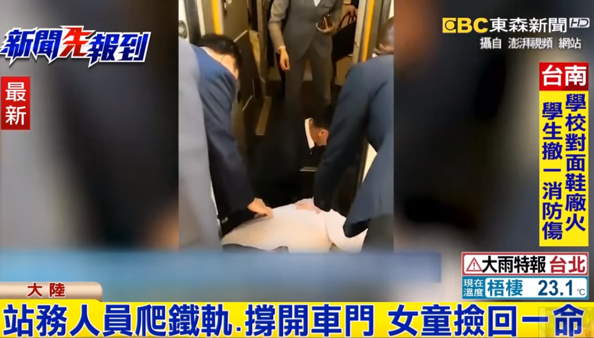 最後由車站工作人員,從另一側鐵軌,爬進火車底下,三四名工作人員,一起將列車門撐開,才順利將小女孩救起,所幸只有頭部稍微腫脹,並無大礙。