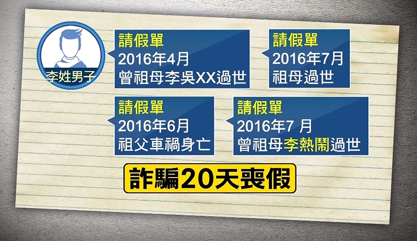 為了休假卻搞詐騙,被判刑的李男子,原本是在陸軍八軍團砲指部服役,他請假的手法太粗糙,因為軍方清查後發現,李姓男子在三個月內,就請了二十天的喪假,先是2016年4月,說曾祖母過世要請喪假,還在訃文上幫曾祖母取了假名,6 月又說祖父車禍身亡,7月祖母也過世,同月曾祖母又再過世一次,這次竟然還改名為李熱鬧,直到連長發現他怎麼一直請喪假,才揭發這場騙局,而李姓男子的曾祖母,早在他服兵役前就過世,祖父母則仍健在。