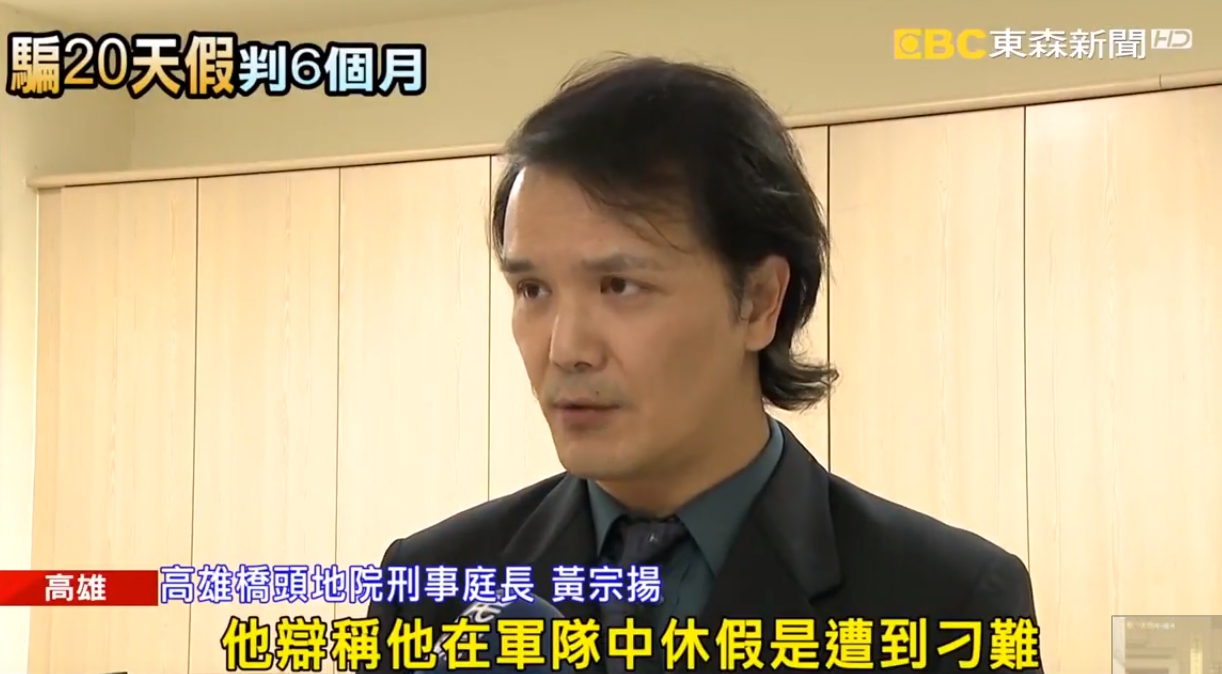 高雄橋頭地院刑事庭長黃宗揚:「他辯稱他在軍隊中休假是遭到刁難,但是經過合議庭審理之後,發現被告在該段期間,仍然有正常休假的記錄,因此可證被告所辯休假,遭刁難的事情是不可採旳。」
