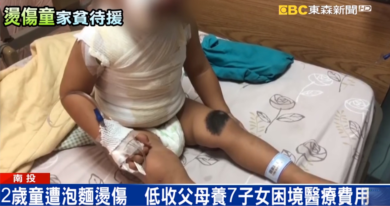 南投縣仁愛鄉一名2歲黃姓男童,16號晚間遭泡麵熱湯燙傷,全身百分之十二燙傷,如果傷口惡化恐須植皮;黃姓一家有7個孩子,全家9口仰賴父母平時打零工維生,雖有請領低收入戶補助,但家境不是很好,面對孩子之後可能植皮與專人照料,恐怕難以負擔。