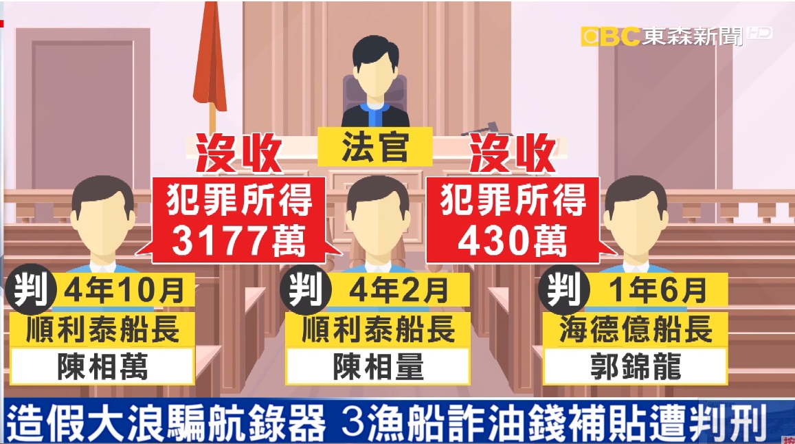 最後新竹地方法院判決,依共同詐欺罪將順利泰船長陳氏兄弟,分別判刑4年10月、4年2月,詐騙所得3177萬沒收,而海德億郭姓船長判刑1年6月,犯罪所得430萬元全數沒收,目前漁業署已進一步改良航程紀錄器,讓它不要成為不肖漁船犯法工具。
