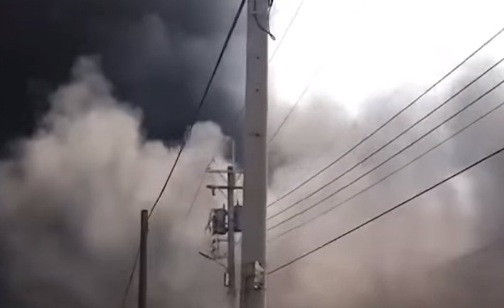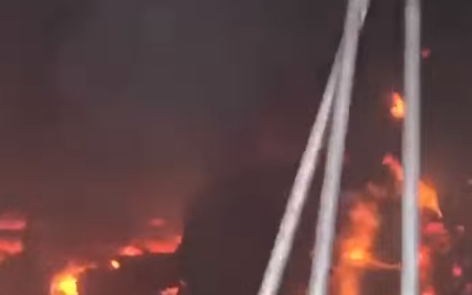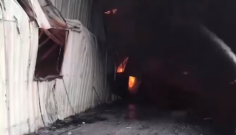 火警發生在22日下午1點多左右,台南市新營區復興路這家傢俱工廠竄出火苗,鐵皮屋頂還因為被火燒而坍陷,隔壁工廠怕被大火延燒波及,趕緊開著山貓把貨物搬出。