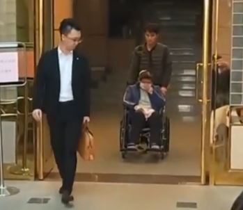 普悠瑪駕駛尤振仲坐在輪椅上不發一語,兩隻手和頭部都還有包紮的痕跡,法官裁定尤振仲以50萬交保,家屬立刻籌錢讓他離開法院。