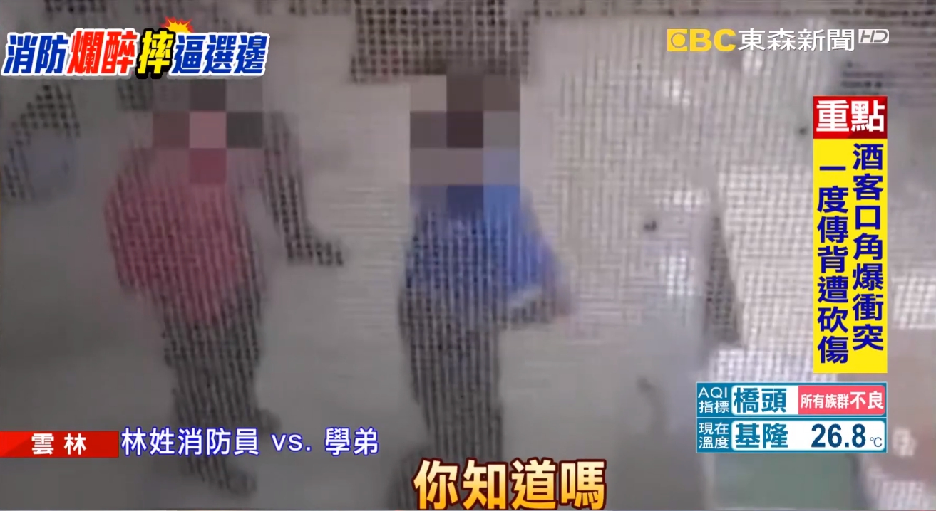 消防隊值班台旁,穿藍色上衣的林姓消防員喝得很茫,站都站不穩還前搖後晃,學弟被他叫到面前連連訓斥。