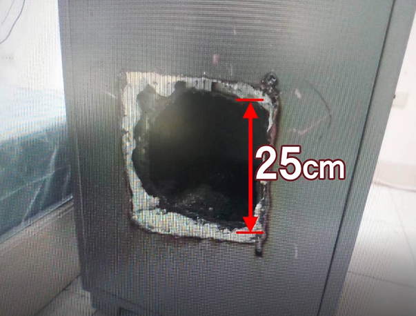 東森新聞記者黃慧婷:「因為保險櫃又大又笨重,嫌犯根本就搬不動,於是他們又想到另外一個方式,就是利用像是這樣子的空壓機,以及電離子切割機,先把這些設備搬到了套房浴室內,再找機會來犯案。」