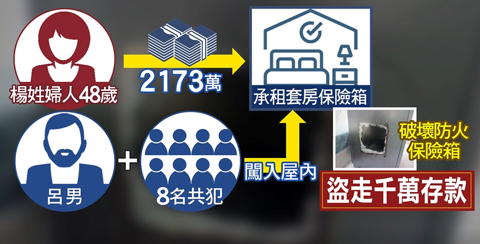 一名呂姓男子覬覦楊姓女鄰居存在保險櫃裡的兩千多萬鉅款,找來8名同夥,計畫一起住宅竊案,呂姓嫌犯先是刻意接近楊姓鄰居,再觀察地形、掌握楊姓女子的作息,潛入她的租屋處,利用破壞工具鑿壞保險櫃,得手兩千多萬,但最後還是被警方逮捕,移送法辦。