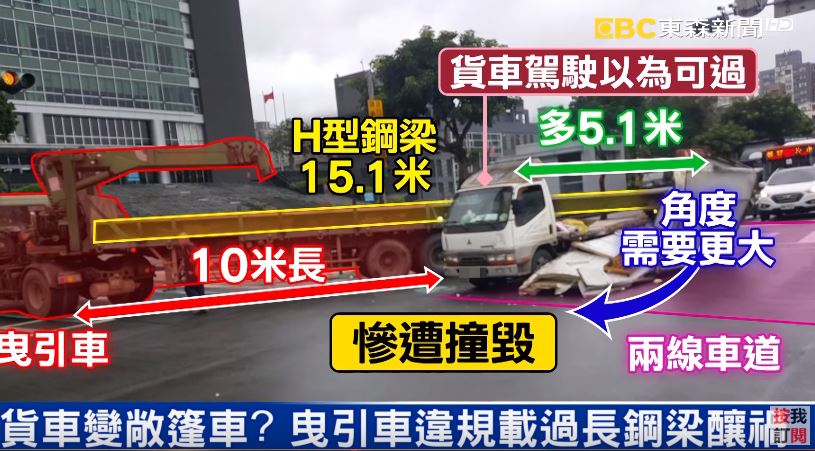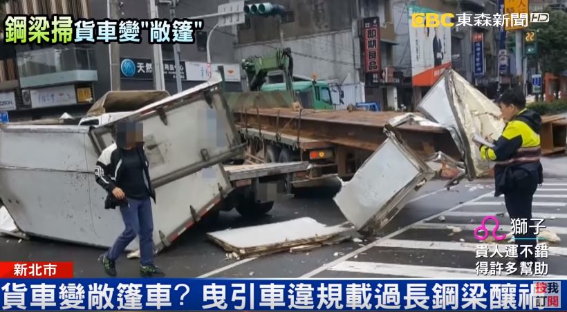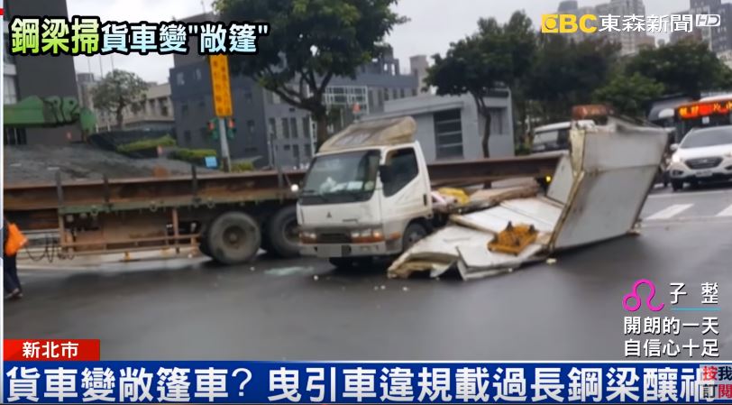昨(31日)上午10點多,一名曳引車駕駛行經新北市汐止新台五路,當時他載著H型鋼梁要到工地,左轉過程中,鋼樑跨越車道,後方的貨車駕駛經過來不及閃避,貨車車斗全毀。