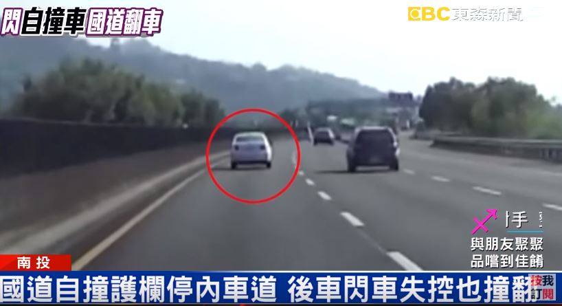 26日下午兩點多,一名29歲的男子開著白色自小客車往南行駛,準備回竹山家中,在國道三號南下233公里處時,疑似變換車道不當自撞分隔島,車身的左側還留下擦撞痕跡,後方47歲的女子開著休旅車,疑似未注意前方狀況,畫面中已經看到前方小客車擦撞分隔島,冒出一陣煙塵,但後方休旅車駕駛疑似未警覺前車出狀況,直到靠近看到轎車停在內車道,緊急要切閃過小客車,卻失控撞到翻車,車內的女駕駛被救出還好沒有大礙。