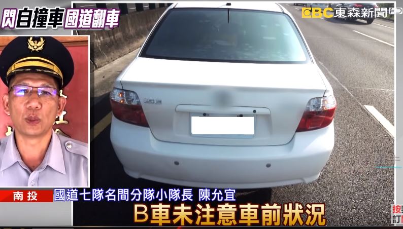 國道七隊名間分隊小隊長陳允宜:「A車因為操作不當自撞內側護欄,B車未注意車前狀況,沒有注意到A車自撞護欄,停在內側車道,所以她閃避A車再撞內側護欄,雙方沒有人受傷。」