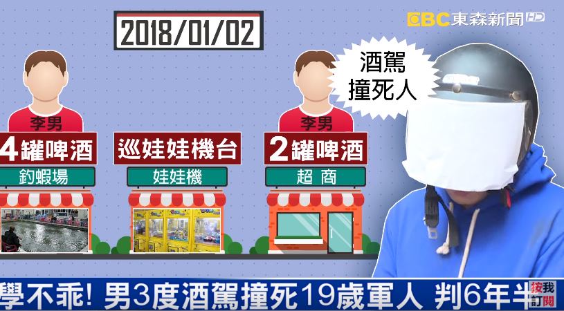 難過向死者家屬表示歉意,但其實李姓駕駛酒駕撞死人已經不是第一次。李姓男子2008年酒駕害死自己女友,當時和家屬和解不起訴,2014年又被抓到酒駕,幸好當時沒有人出事,但2018年,他三度酒駕撞死19歲志願役軍人,被判處6年半刑期。