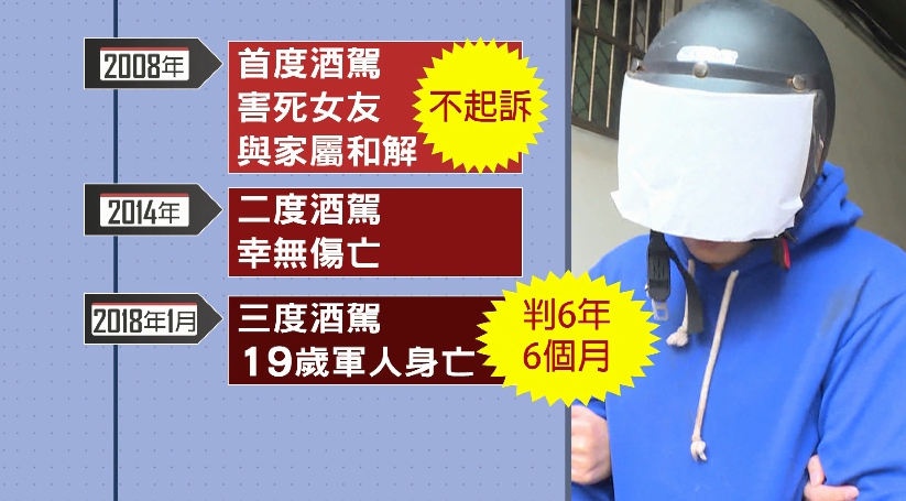 基隆一名李姓男子2008年酒駕害死女友,雖然和死者冥婚獲得家屬原諒不起訴,但沒想到他2018年再犯,三度酒駕,撞死年僅19歲的林姓志願役軍人,法官判李姓男子6年半刑期,死者家屬無法接受,養了19年摯愛的孩子被酒駕撞死,判太輕,他們已經上訴。