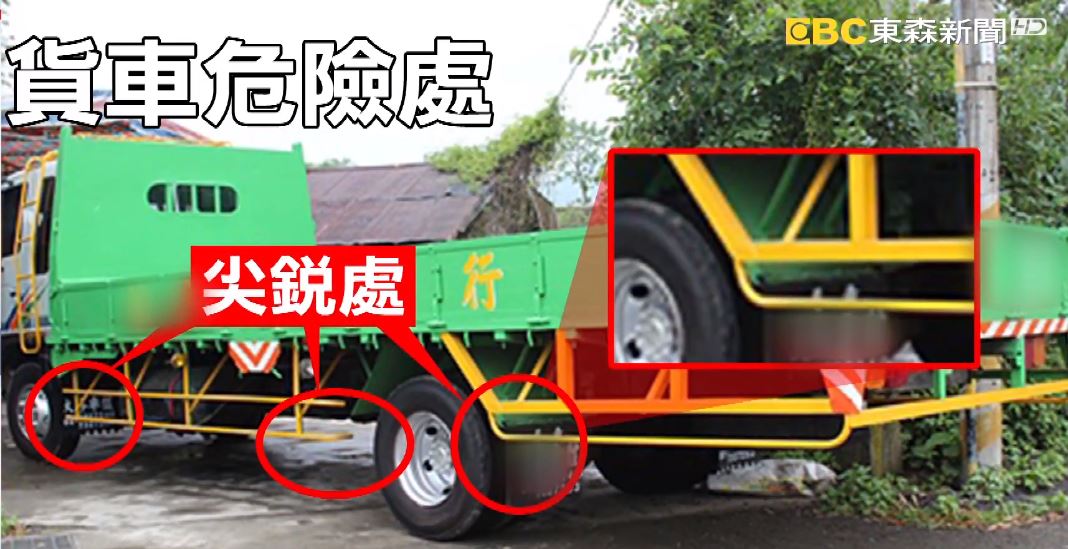 就像這輛貨車,車邊裝置防護欄,要防止騎士捲入,但若是穿了雨衣,可能又成了另一種殺手,防護欄的邊角,就有 1、2、3,3個護欄缺口,很有可能因為太靠近,釀成意外。