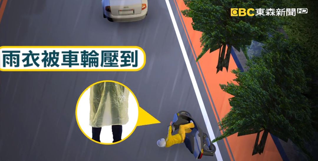 身邊沒有大貨車經過也不能掉以輕心,穿著輕便雨衣,距離一般轎車要保持適當距離,否則很可能因為雨衣太長或飄起,被旁邊車輛壓到,導致整個人身陷險境,飄起來的雨衣真的很危險,民眾參加機車道路講習,也常常提到這樣的雨衣很不安全,但要如何防止呢?