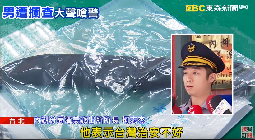 內湖分局潭美派出所所長柯志杰:「(自稱)家裡煮飯的時候,他要切菜使用,另外這把彈簧刀,他表示台灣治安不好所以他要攜帶這把刀械防身。」