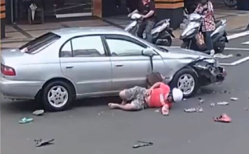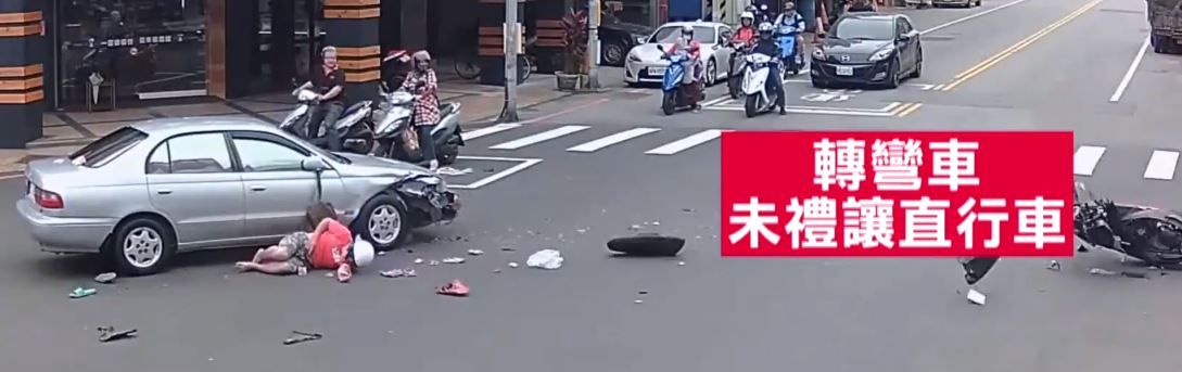 花蓮一處十字路口,銀色轎車突然左轉,對向機車冷不防直接迎面撞上,撞擊瞬間,整台紅色機車幾乎解體,黑色椅墊在空中轉了好幾圈,騎士腳上拖鞋噴飛出去,試圖想起身,但撞擊力道太大,騎士疼痛不已,只能坐在地上,後方黑衣機車騎士,驚嚇到連人帶車倒退好幾步,危險一刻,發生在上個月30號,吉安鄉建國路一段與自強路交叉路口轉彎處,沒有禮讓直行車,無預警左轉,難免發生意外,也讓對向車輛措手不及。