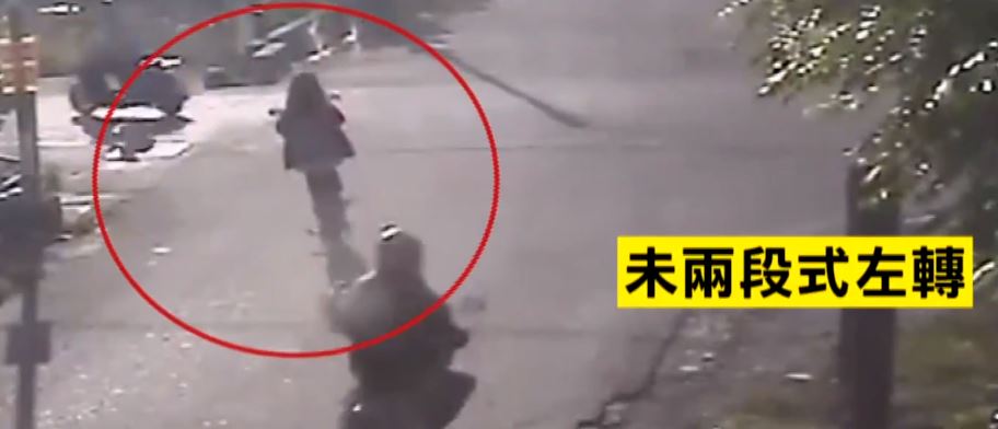 將鏡頭換個場景,另一起危險事故,發生在明仁一街與北安街交叉路口,馬路上有不少車子來來去去,騎著電動自行車的長髮女子,沒有兩段式左轉,直接左轉,導致遭到對向機車直接遭撞倒在地,驚險畫面,不斷上演。
