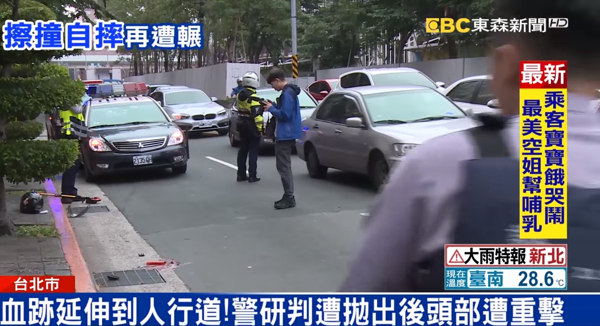 整起車禍事件就發生在9號早上7點多,台北市忠孝東路跟光復南路口,警方初步懷疑,轎車在變換車道時,沒注意到機車,機車勾到後照鏡後重心不穩,之後轎車再撞上去,導致騎士頭部撞到人行道上。