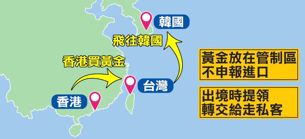 香港因為沒有消費稅和出入口限制,走私客買回黃金後,先在將黃金暫時存放,桃園機場管制區,下次出國時再提領出來,由走私客夾藏進入日韓兩國。