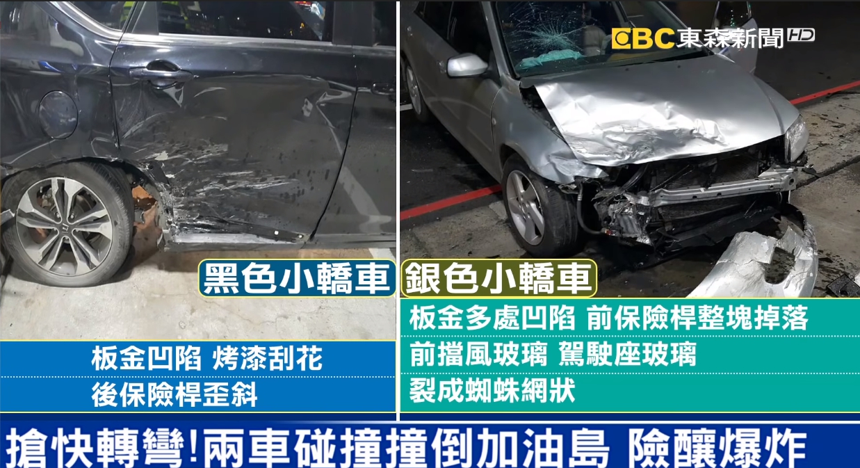 一輛銀色小轎車直線開來,就在經過加油站時,對向車道一輛黑色轎車,疑似要加油就直接左轉,銀色轎車就這麼撞上黑色轎車右後側,黑色轎車被撞後失去平衡,270度打直往後朝加油島撞了過去「碰」的一聲,加油島應聲倒地,加油站人員看到意外,趕緊打電話報警。