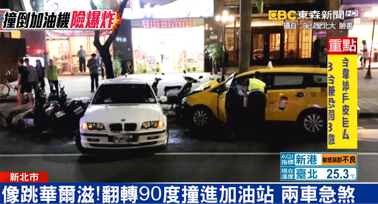 昨天(11/9)晚間8點多,新北市鶯歌一間加油站外發生兩輛小轎車碰撞車禍,其中一輛車還波及加油站,把加油島撞倒在地,所幸車禍沒有造成漏油跟人員受傷;在三峽北大學成路上,也有計程車司機疑似因為精神不濟,撞上路邊停車的轎車,還波及到旁邊機車。