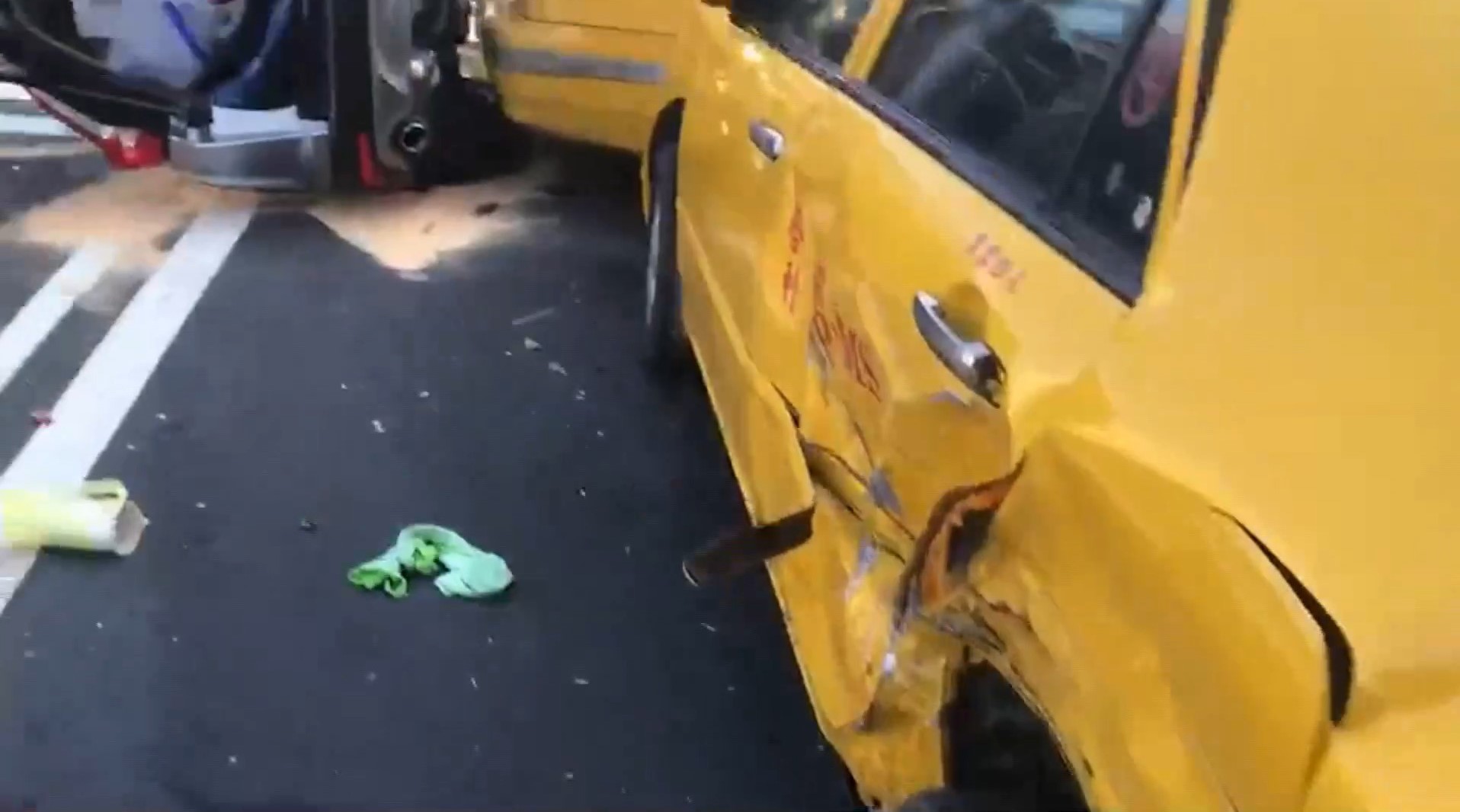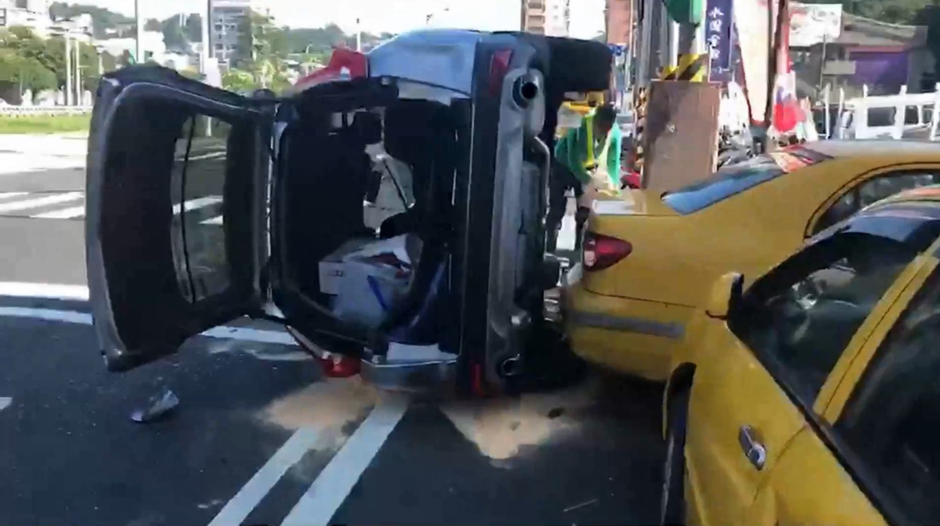 驚險一刻全被行車紀錄器拍下,一輛銀色廂型車撞上路口汽機車和行人,成了這副模樣。銀色廂型車就這麼側翻在大馬路邊,擋風玻璃裂成大片蜘蛛網狀,地上血跡斑斑,一旁計程車鈑金嚴重毀損。