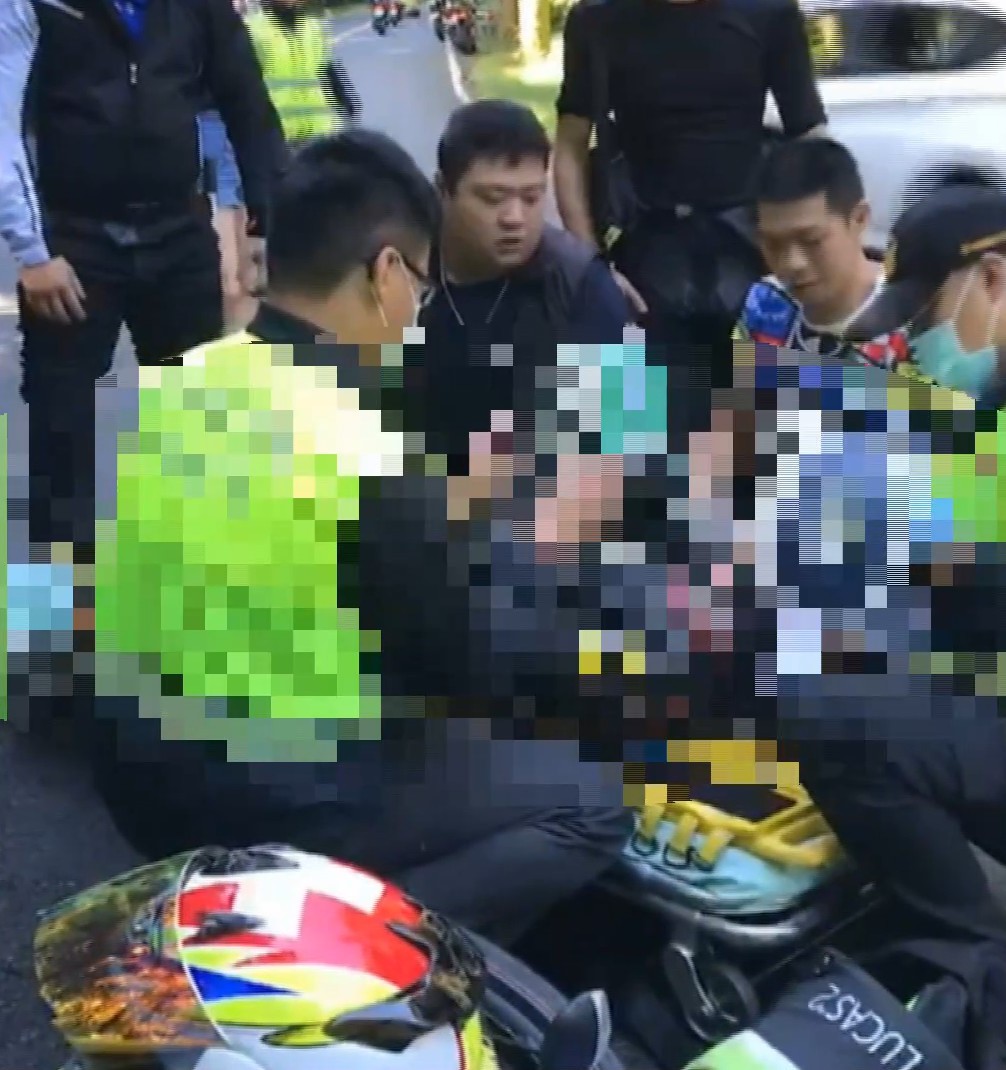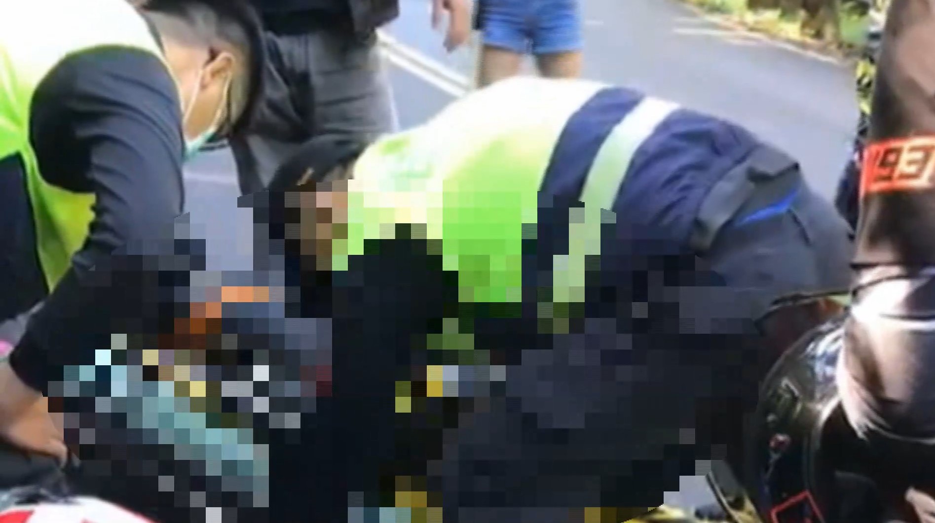 救護人員要親友一起替他加油,因為這一刻,騎士正和死神拔河。11日上午10點多,這名28歲的周姓騎士和女友以及朋友相約在石碇區牌樓集合,準備沿著106線道,轉北宜公路前往宜蘭遊玩,並且由周姓騎士前導開路,但是沒想到卻在彎道的地方,因為不知名原因自摔倒地,傷勢相當嚴重。