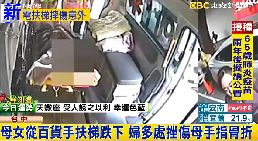 據目擊的櫃姐表示,當時手扶梯已經上到快接進一半的位置,但兩個人卻重心不穩往下傾斜,連人帶著輪椅摔落,婦人全身多處挫傷,而坐在輪椅上的老母親,左手指骨折,兩人意識清楚,沒有生命危險。