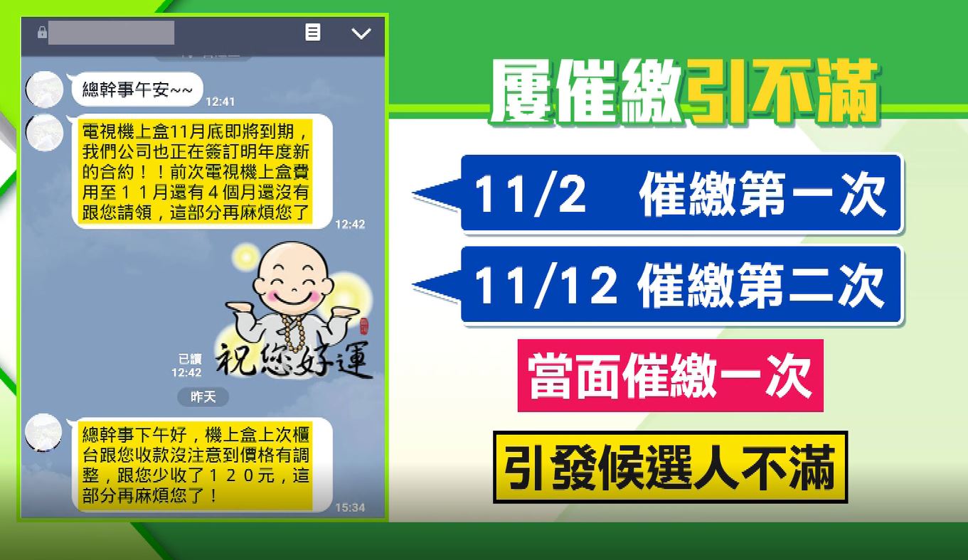 釐清整起事發經過,這名候選人住在大樓5樓,長期和3樓的旅店租借機上盒,原本每個月150元,之後漲價成180元,四個月來需要補繳120元,但是旅店業者11/2號催繳一次,11/12號又催繳第二次,甚至還當面催繳一次,讓候選人一瞬間耐不住性子。