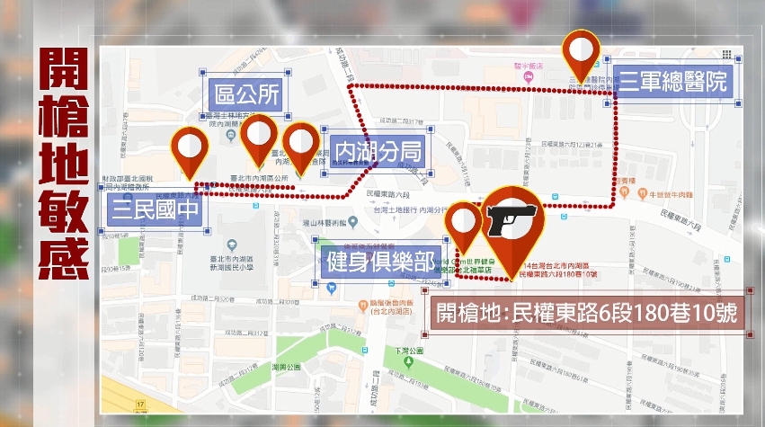 12號晚間10點多,附近大樓監視器拍下,遠方有模糊的人影晃動,正是槍手與被害人發生激烈衝突的時刻,當時何姓與顧姓男子從巷口走過來準備牽車,才一坐上車,埋伏在旁的槍手就立刻出現,朝他們開槍,兩名被害人嚇得立刻狂奔,槍手還追上前邊跑邊開槍,初步估計連開9槍,由於事發地點就在內湖鬧區,也嚇壞附近住戶。
