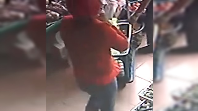 (圖/穿著紅色外套的女子剛買完水果,抽了一張紙鈔轉身一離開,就把錢直接塞進上衣口袋裡,再回頭走到櫃檯,佯裝老闆找錯錢)