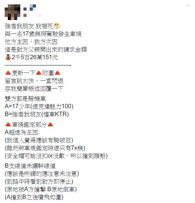 一名網友近日在臉書上表示,朋友日前騎車時,與一名17歲無照的騎士發生車禍,結果少年的父親竟然列清單向朋友索賠2526萬151元,索賠明細在網路上曝光後,引起網友熱議。