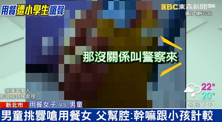 新北市一家自助餐店,昨天(19)晚間發生口角衝突,一名國小男童一進到店內,就強硬告訴另一名用餐女子說要坐在她的座位,被指正說沒有禮貌之後,男童甚至還扮鬼臉與嗆聲反擊,但男童父親在旁不但沒有制止,還告訴男童說你沒有錯,影片被PO上網引發網友兩面評價,有人說男童父親沒有負起管教責任,也有人說是女子太小題大作。