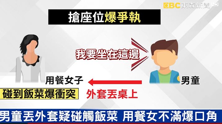餐廳員工趕緊出來緩頰這才讓衝突稍稍平息,但到底發生什麼事情?原來19日晚間8點多,這名女子前往自助餐店用餐,吃飯吃到一半突然跑來一名男童,一開口就直接問說你吃完了嗎?我要坐在這裡,甚至直接把外套丟在桌上,碰觸到女子的飯菜,才會爆發衝突。