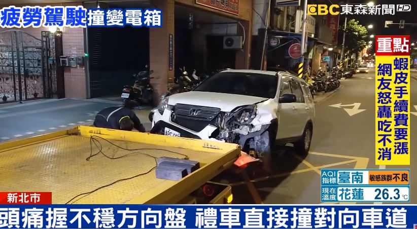 凌晨12點,陳姓駕駛開著跟朋友借的休旅車,從五股經過板橋篤行路,車子失控衝向對向車道時,還有好幾台車經過,其中一輛計程車雖然緊急剎車,但還是被休旅車的車尾狠狠撞了一下,只是計程車駕駛疑似趕路,所以沒有停下來查看車況,白色休旅車車頭被撞凹一個洞,旁邊車門把還綁著紅色彩帶,這輛車本來是陳姓駕駛,為了參加喜宴,特地跟朋友借來當禮車,回家路上載著妹妹,疑似因為疲憊,加上身體不舒服頭痛才會失控撞車。