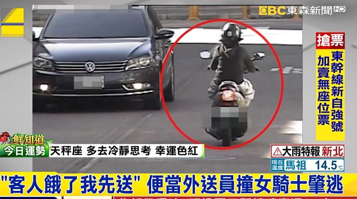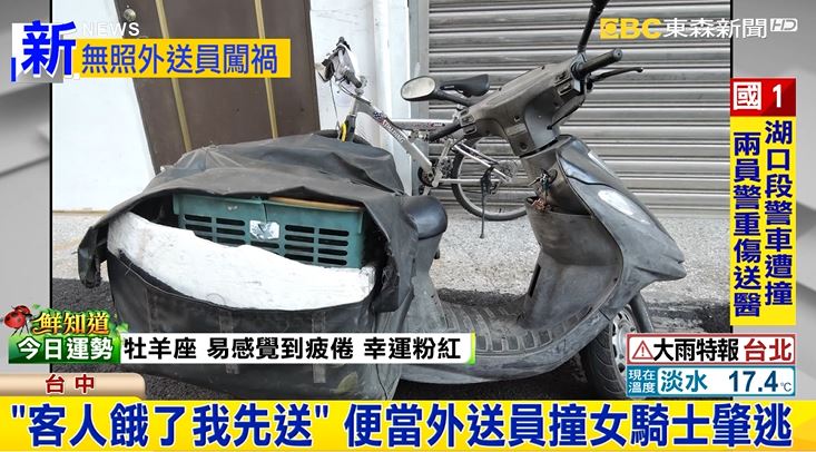 台中一名外送員,騎車送便當途中撞到一名女騎士。外送員卻謊稱老闆交代「顧客至上,使命必達」不能讓客人餓肚子,要求傷者先讓他送完便當再回來,結果一去不回。女騎士報警後肇逃男子被揪出來,原來他根本無照。