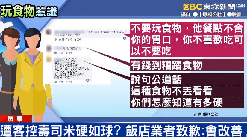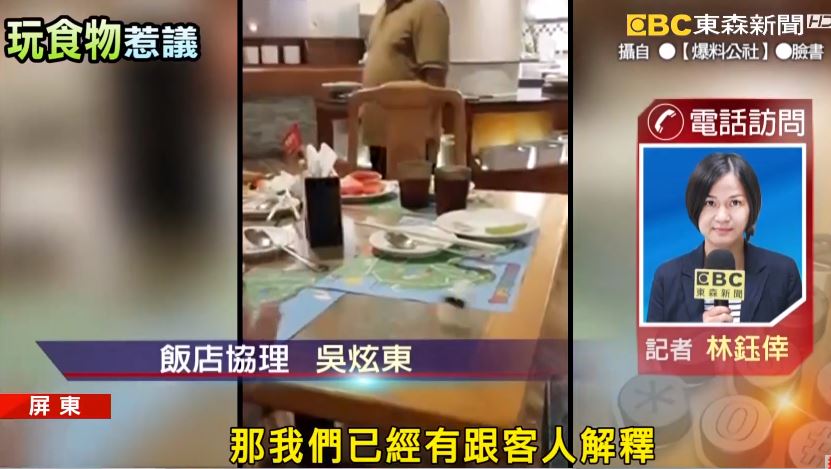 被指控的是墾丁一家五星級飯店,業者表示會改進,民眾將影片po網後,引起熱烈討論,有網友說「不要玩食物,餐點不合你的胃口,你不喜歡吃可以不要吃。」還有人說「有錢到糟踏食物。」但也網友替拍攝民眾說話「說句公道話,這種食物不丟看看,你們怎麼知道有多硬?」也有人說「可以反應吧!何必玩食物?」