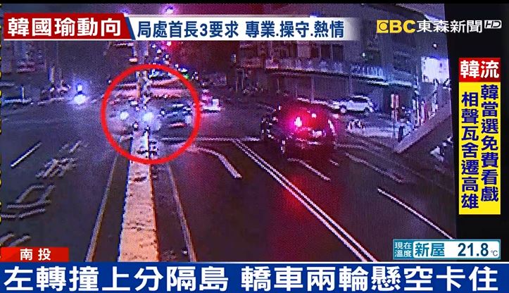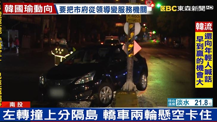 南投一台轎車轉彎撞上分隔島卡住,但駕駛沒報警棄車逃逸,警方找到駕駛,他聲稱因為身體不適才撞上分隔島,警方對他開出車禍未依規定處理,1千到3千元的罰單。