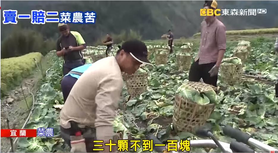 台灣今年氣候良好,各地高麗菜大豐收,盛產的狀況下,導致供需失衡,高麗菜價格大崩盤,宜蘭大同鄉南山村高麗菜,一簍約30顆的高麗菜,價格只要50元,零售價1斤更是只剩5元,讓菜農直呼「賣一顆賠兩顆」,苦不堪言。