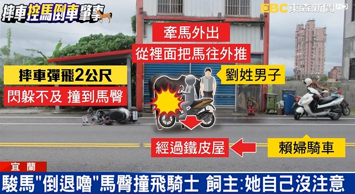 宜蘭這名71歲的賴姓婦人指控,日前中午買完午餐回家途中,經過一處鐵皮民宅時,裡頭的劉姓飼主疑似要牽馬外出,當時馬頭朝內臀部朝外,劉姓飼主從屋內把馬往外推,因為這樣導致看不到馬路上狀況,賴姓婦人經過正好被馬臀部撞到,他整個人重心不穩噴飛到快車道上左小腿因此受傷。