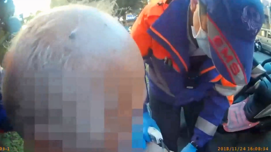 救護人員:「放鬆,放鬆,不要動,我幫你扶著,你就放鬆就好。」