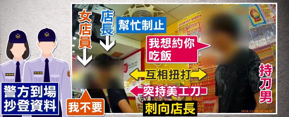 持美工刀刺店長,發生在1日上午8點多,新北市土城裕民路上的彩券行,持刀的陳姓男子是彩券行的常客,非常喜歡一名女店員想追求她,邀約對方吃飯,卻遭拒絕,店長得知之後上前緩頰,2人卻發生拉扯,其他人幫忙報案,但陳姓男子居然無視警方在場,拿出身上預藏的美工刀刺向店長。